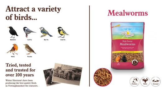 Harrisons High Energy Mealworms 500g – Nutritious Wild Bird Treats Harrisons Dried Mealworms are a highly nutritious and tasty treat for garden birds, providing all the benefits of live mealworms with the convenience of dried feed. Perfect for attracting robins, blackbirds, thrushes, and other insect-eating birds, these mealworms are an...